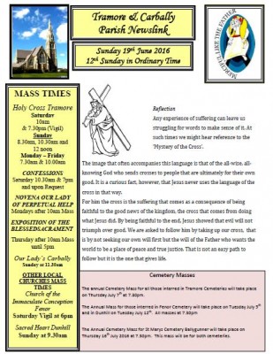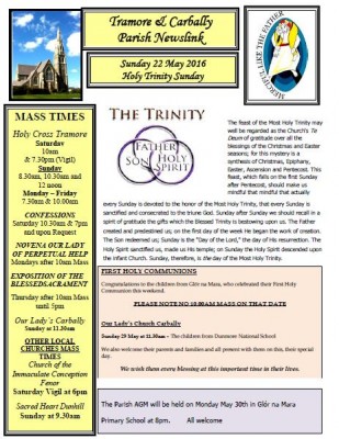 CLICK HERE to download the full Newsletter Newsletter 22nd May 2016 Trinity Sunday The feast of the Most Holy Trinity may well be regarded as the Church’s Te Deum of gratitude over all the blessings of the Christmas and Easter seasons; for this mystery is a synthesis of Christmas, Epiphany, Easter, Ascension and Pentecost.... READ MORE ... READ MORE