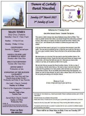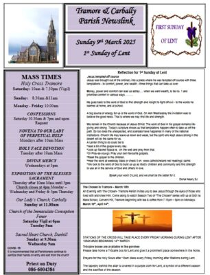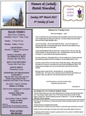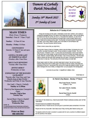 St Patrick's Day Masses, and a Reflection for the Transfiguration of Christ, as well as Events for Young Adults, and details for a Coffee morning in aid of Tramore Hospice.... READ MORE