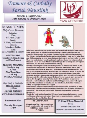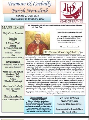 CLICK HERE to download the full Newsletter Newsletter 21st July 2013 St Declan On Wednesday, 24 July, we celebrate the principal patron of our Diocese, St. Declan, a prince of the Decies Kingdom in Munster, was born in the 5th century. He was baptised by a priest named Colman, later to become St. Colman.... READ MORE ... READ MORE