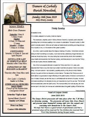 The Corpus Christi procession will take place after the 7.30 Mass on Saturday evening June 22nd. The procession will leave Holy Cross Church and proceed down Summerhill turning right into the car park and concluding with Benediction in the Canon’s field.... READ MORE