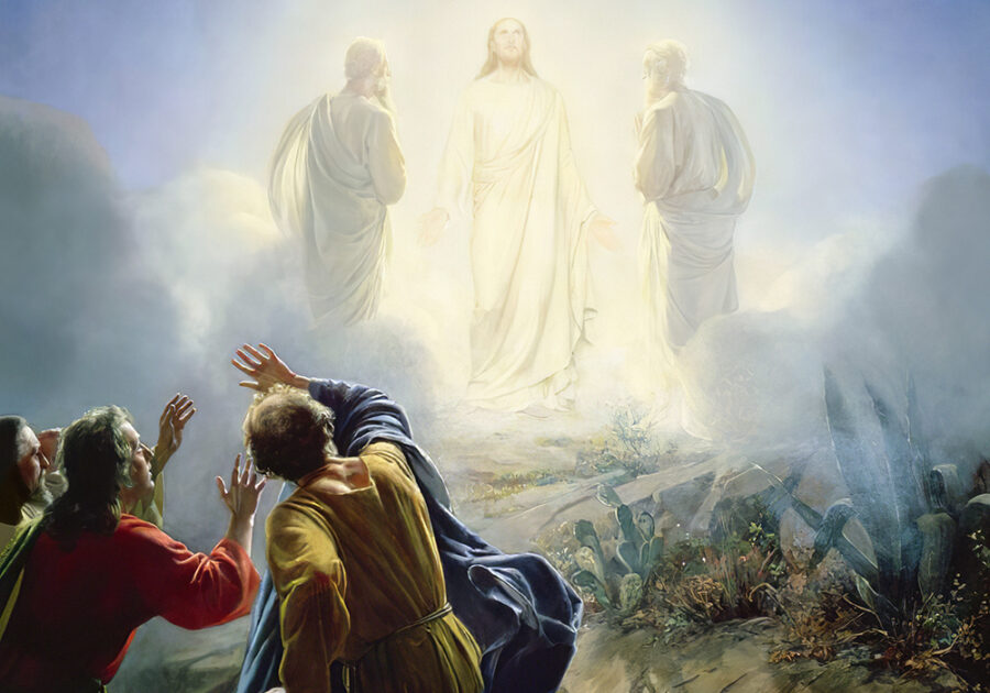 Jesus took with him Peter and John and James and went up the mountain to pray. As he prayed, the aspect of his face was changed and his clothing became brilliant as lightning. Suddenly there were two men there talking to him; they were Moses and Elijah appearing in glory, and they were speaking of his passing which he was to accomplish in Jerusalem. Peter and his companions were heavy with sleep, but they kept awake and saw his glory and the two men standing with him. As these were leaving him, Peter said to Jesus, ‘Master, it is wonderful for us to be here; so let us make three tents, one for you, one for Moses and one for Elijah.’ – He did not know what he was saying. As he spoke, a cloud came and covered them with shadow; and when they went into the cloud the disciples were afraid. And a voice came from the cloud saying, ‘This is my Son, the Chosen One. Listen to him.’ And after the voice had spoken, Jesus was found alone. The disciples kept silence and, at that time, told no one what they had seen.