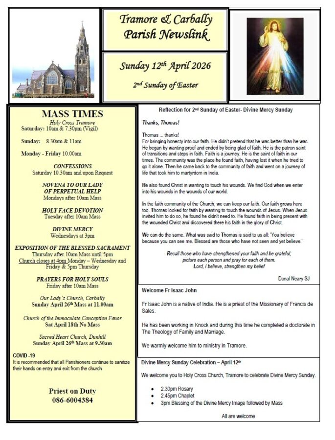 We welcome you to Holy Cross Church, Tramore to celebrate Divine Mercy Sunday.