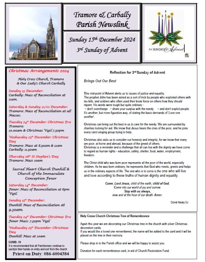 Live Streaming facility is in operation, where you may join us for Tramore Parish Services online from Holy Cross Church.