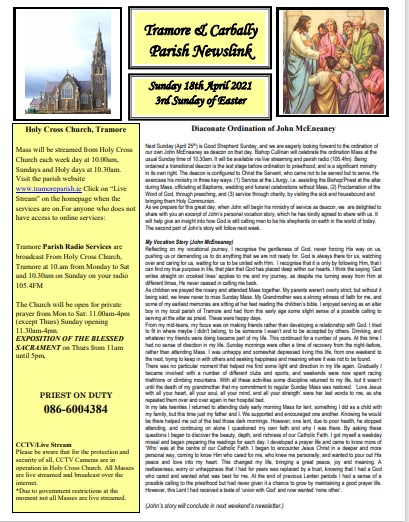 Next Sunday (April 25th) is Good Shepherd Sunday, and we are eagerly looking forward to the ordination of our own John McEneaney as deacon on that day. Bishop Cullinan will celebrate the ordination Mass at the usual Sunday time of 10.30am. It will be available via live streaming and parish radio (105.4fm). Being ordained a transitional deacon is the last stage before ordination to priesthood, and is a significant ministry in its own right. The deacon is configured to Christ the Servant, who came not to be served but to serve. He exercises his ministry in three key ways: (1) Service at the Liturgy, i.e. assisting the Bishop/Priest at the altar during Mass, officiating at Baptisms, wedding and funeral celebrations without Mass, (2) Proclamation of the Word of God, through preaching, and (3) service through charity, by visiting the sick and housebound and bringing them Holy Communion.