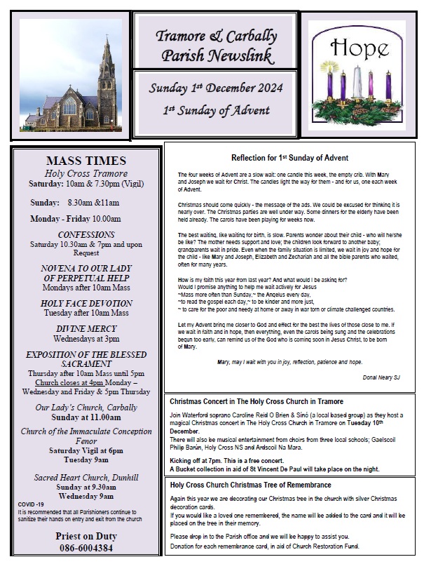 The annual collection for the Society of St Vincent de Paul will take place before Masses at the Parish Churches in Tramore & Carbally, on next Saturday 7th and Sunday 8th December 2023