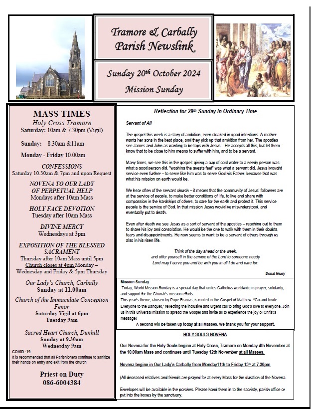 The Remembrance Mass for all who died in our parishes in the past twelve months takes place in Carbally on Friday Nov 15th at 7.30pm and in Tramore on Thursday 28th Nov at 7.30 pm