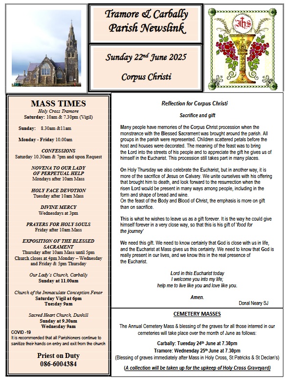 Diocese of Waterford & Lismore Corpus Christi Procession Led by Bishop Alphonsus Cullinan, on Sunday June 22nd, Meeting at 3.30pm. Route: Sacred Heart Church to the Cathedral of the Most Holy Trinity. All Welcome.