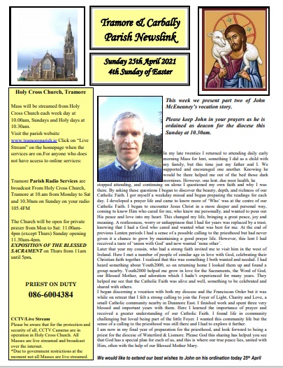 Pray for vocations to the priesthood and consecrated life, especially for our diocese. If you are considering such a vocation, speak to your local priest or Diocesan Vocations Director, or email the National Vocations Office: email: info@vocations.iewith the government regulations, we are looking for volunteers to help with stewarding at the Masses.