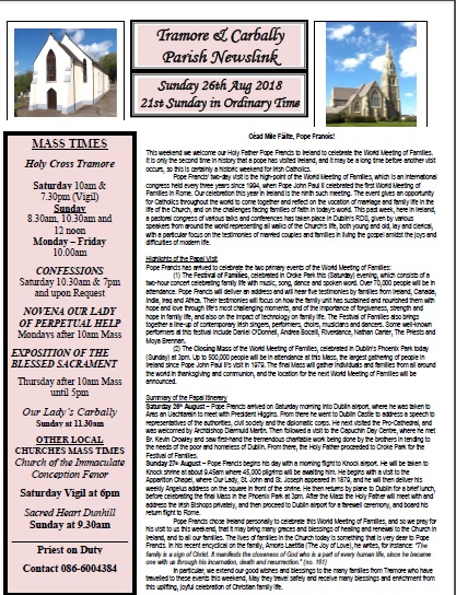 In particular, we extend our good wishes and blessings to the many families from Tramore who have travelled to these events this weekend, May they travel safely and receive many blessings and enrichment from this uplifting, joyful celebration of Christian family life.