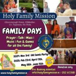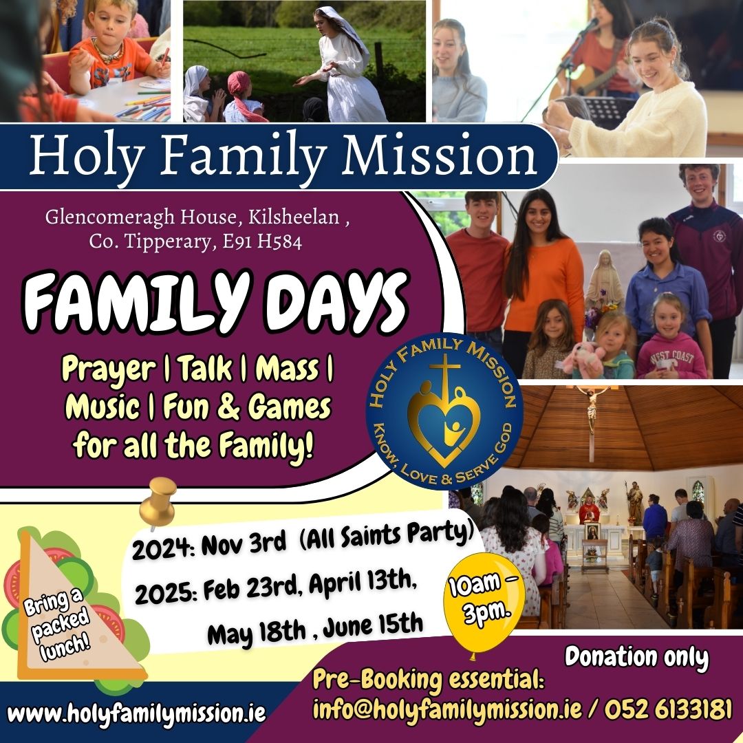 Sunday 3rd November and it’s our All Saints party! Fun and games for all the family! Come along and dress as your favourite saint! 10am – 3pm. Donation only. Pre-booking essential. www.holyfamilymission.ie