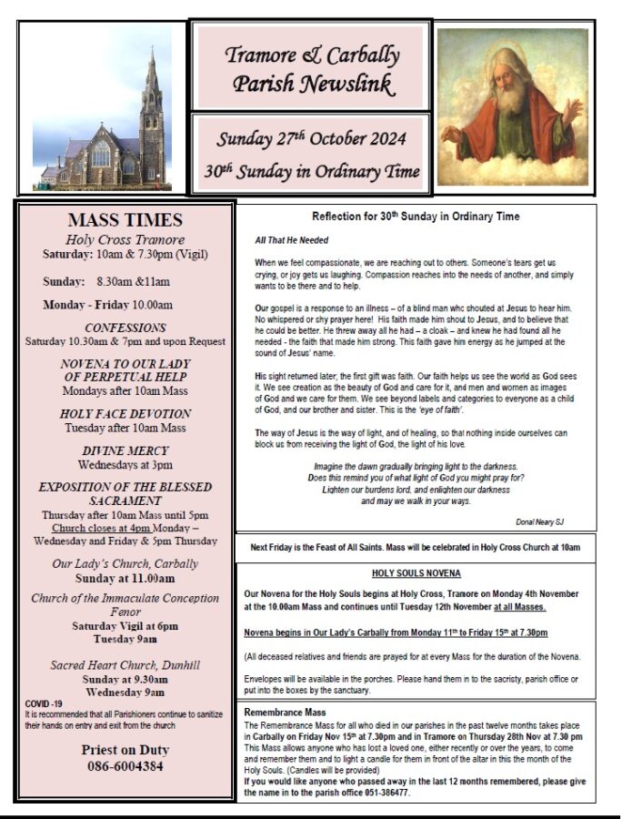 The Remembrance Mass for all who died in our parishes in the past twelve months takes place in Carbally on Friday Nov 15th at 7.30pm and in Tramore on Thursday 28th Nov at 7.30 pm