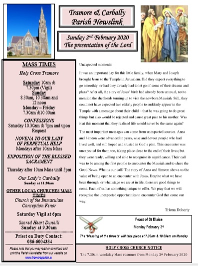 The Annual Diocesan Pilgrimage to Lourdes will be from 3rd to 8th June 2020. Booking is already open and you may book online www.joewalshtours.ie where you can avail of a €10 Discount. Contact the Lourdes booking office in Waterford on 051-878900 from 9am to 5.30pm Monday to Friday. Please note that if you wish to visit the Waterford office it be open on Monday and Thursday from 10am to 2pm.