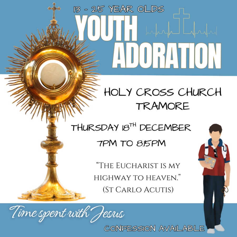 Youth adoration in Holy Cross Tramore on Thursday 18th December, from 7 to 8.15pm. Confession available on the evening.